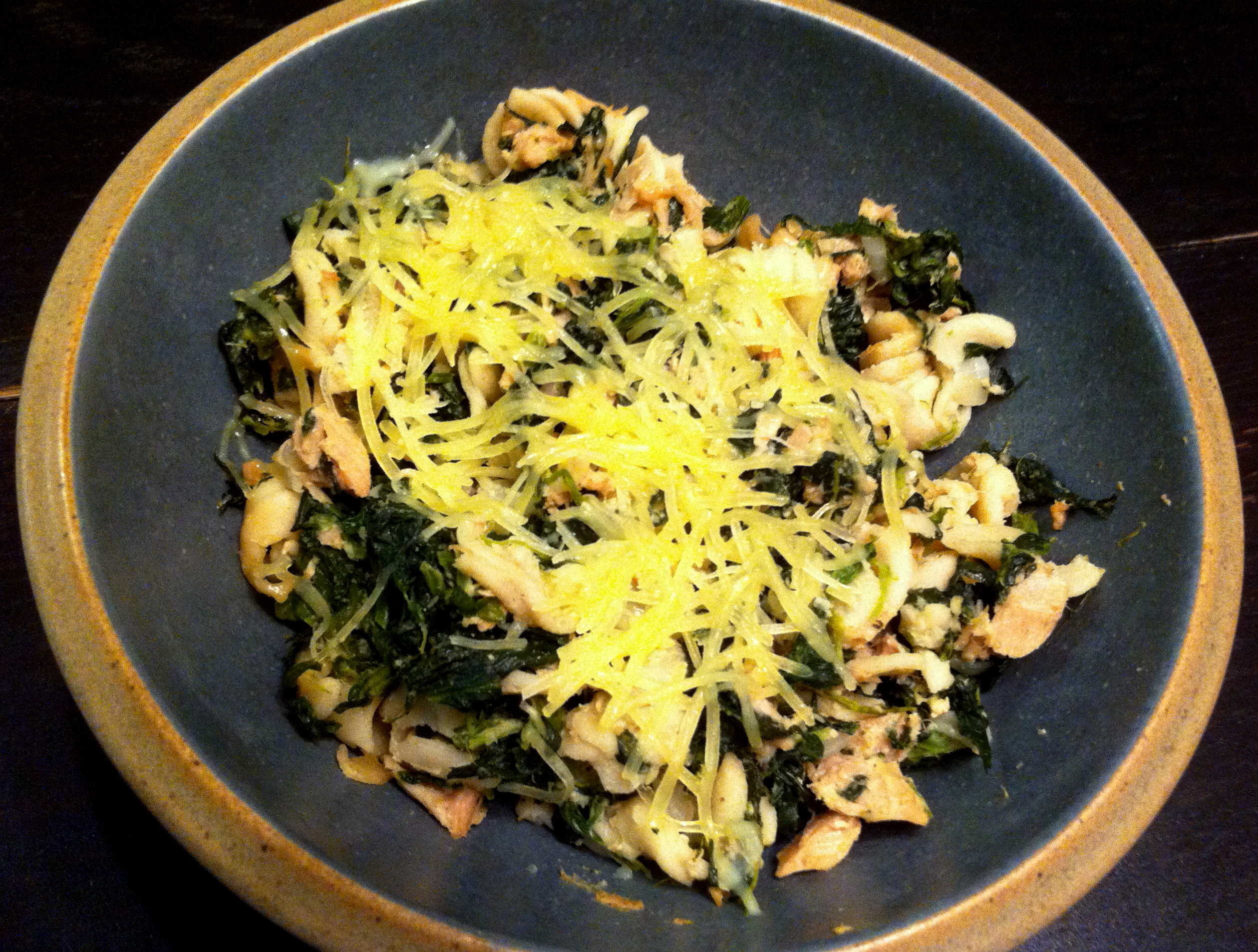 Remove from heat and fold in the parsley, Parmigiano Reggiano, spinach, tuna, and pasta.